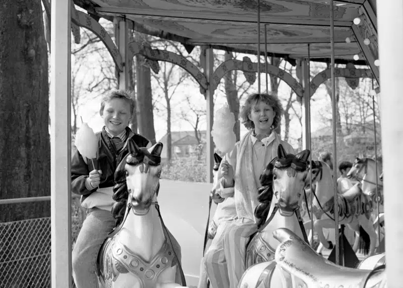 Foto: Tivoliland Karolinelund, Simon Nørgård på karrusellen, 1987.