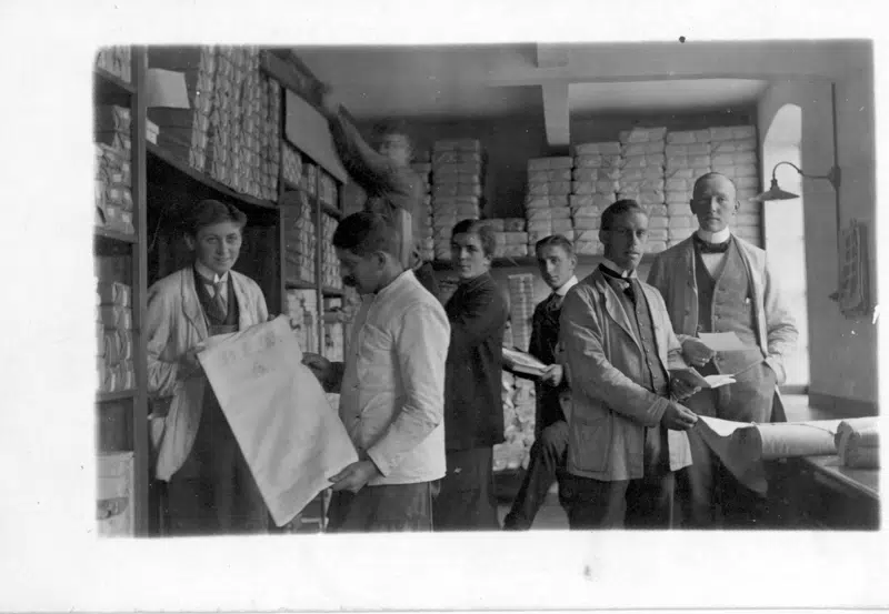 Foto: De Forenede Tekstilfabrikker, interiør, ukendte mandlige ansatte kigger på stof, 1913.