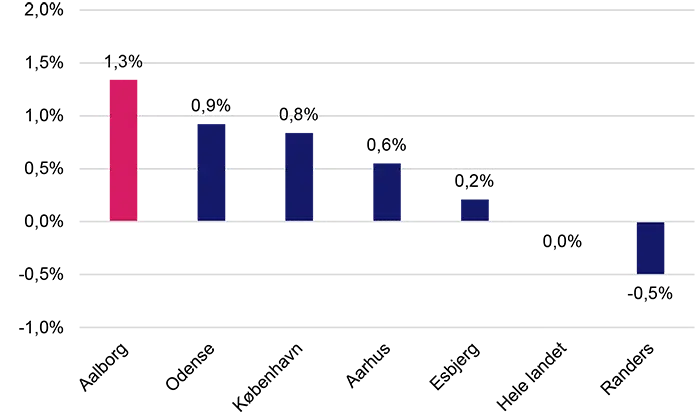 Blandt 6-byerne har Aalborg haft den højeste vækst i antallet af virksomheder med ansatte det seneste år. Aalborgs vækst er på 1,3 procent. Odense, København og Aarhus har også haft vækst i antal virksomheder på hhv. 0,9 procent, 0,8 procent og 0,6 procent. Esbjerg har haft en mindre vækst på 0,2 procent. I hele landet er antallet af virksomheder med ansatte stort set uændret. Endelig har Randers, som den eneste 6-by, haft tilbagegang i antallet af virksomheder på ca. 0,5 Procent.