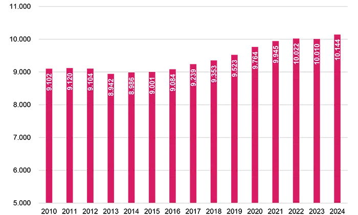 Note: Antal virksomheder med mindst én ansat er målt ultimo året. Tal for 2024 er offentliggjort d. 18. november 2025.