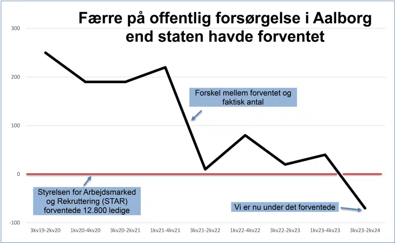 Som storby og uddannelseskommune har Aalborg nogle særlige rammevilkår, som Beskæftigelsesministeriets benchmark analyse tager højde for. Analysen viste i 2024, at antallet af borgere på offentlig forsørgelse i Aalborg Kommune for første gang var lavere end forventet i forhold til rammevilkårene. Der var forventet 12.800 fuldtidspersoner, men det faktiske tal var 12.730.