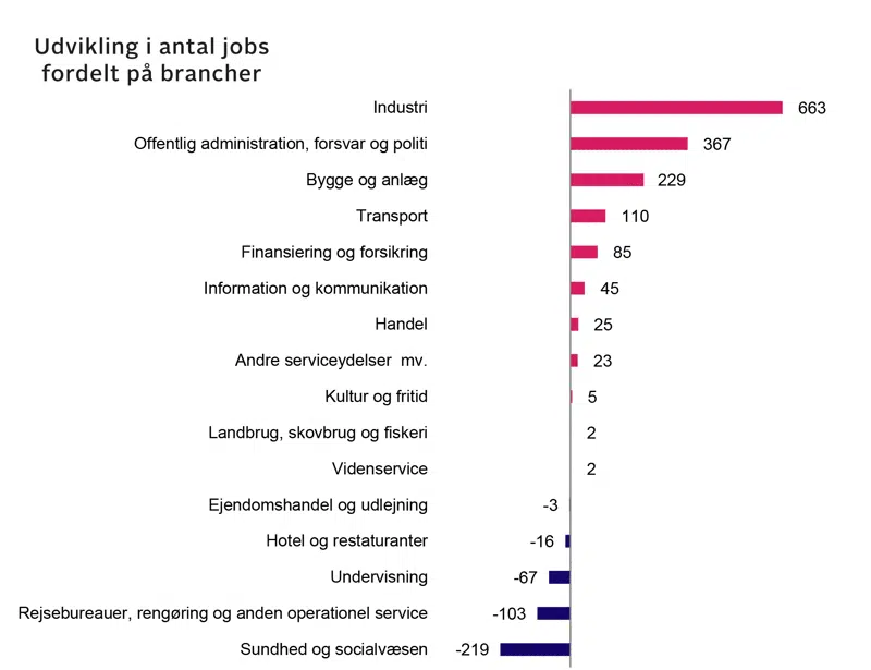 Fra 3. kvartal 2023 til 3. kvartal 2024 blev der i alt skabt 1.151 nye jobs. Det var især virksomheder inden for Industri, Offentlig administration, politi og forsvar samt Bygge og anlægsbranchen, som ansatte nye medarbejdere. Samlet set var der 119.351 beskæftigede lønmodtagere, hvor Sundhed og Socialvæsen, Handel samt Industri udgjorde de største brancher.