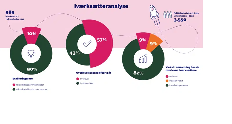 Den 3 årige overlevelse for virksomheder etableret i 2018 var for Aalborg og Aarhus på 50 procent, mens landsgennemsnittet og Esbjerg var på 49 procent. Randers og København havde begge en 3 årig overlevelsesprocent på 47.