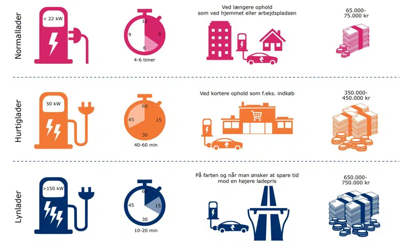 Billedtekst: Overordnet set inddeles ladestanderne i tre grupperinger: normalladere, hurtiglader og lynladere. Disse adskiller sig fra hinanden i forhold til, hvor mange kW de kan levere. Dette har betydning for, hvor lang tid det kan tage at lade ved dem og dermed, hvor det giver bedst mening at placere ladestanderen. Derudover har ladestandertypen betydning for anlægsomkostningerne. De angivne anlægsomkostninger er gennemsnitlige priser inklusiv tilslutningsbidrag og entreprise/tilslutning.