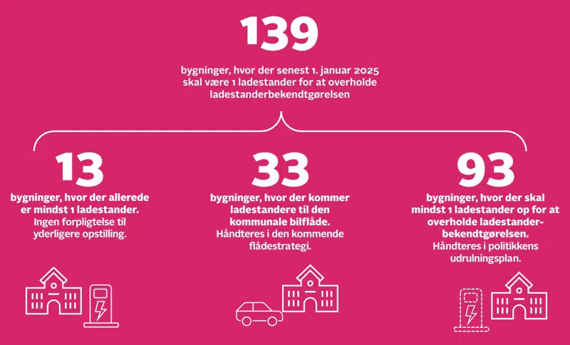 Dette betyder i praksis, at der skal opstilles en ladestander ved en lang række af Aalborg Kommunes haller, skoler, daginstitutioner og administrationsbygninger. Antallet af bygninger, der er omfattet af kravet, afdækkes under afsnittet 'Aalborg Kommune som bygningsejer.