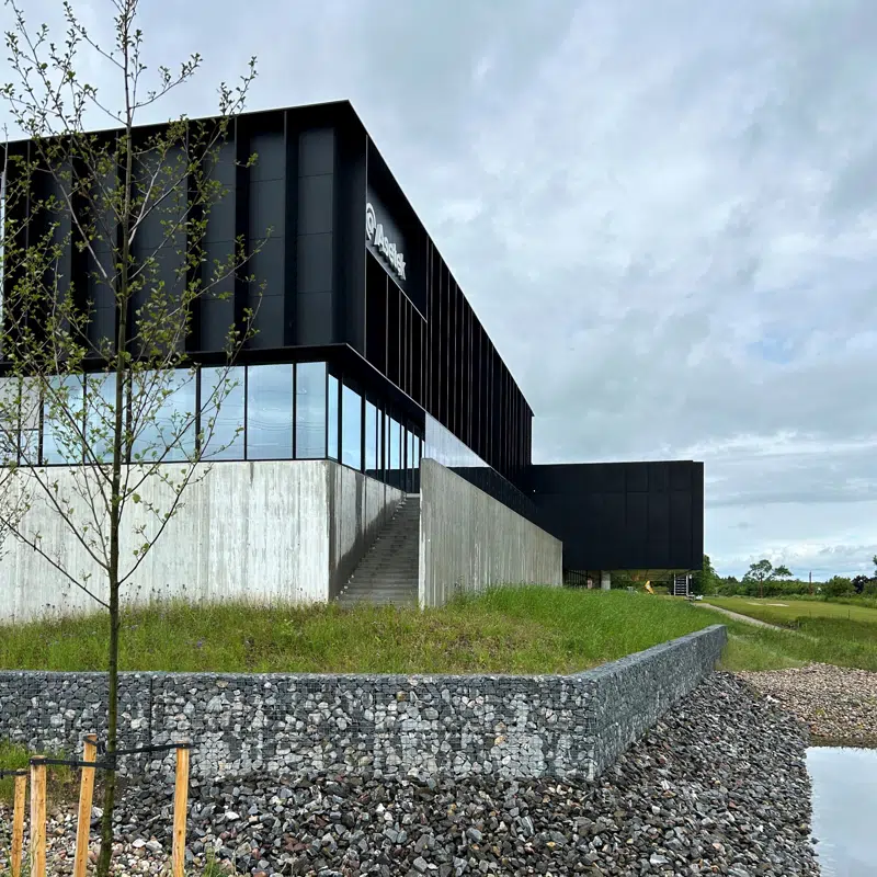 Bygningen folder sig naturligt ind i det kuperede landskab med store bygningsvolumener i et minimalistisk design. Asetek består af 4 bygningskroppe, der omkranser en grøn atriumgård.